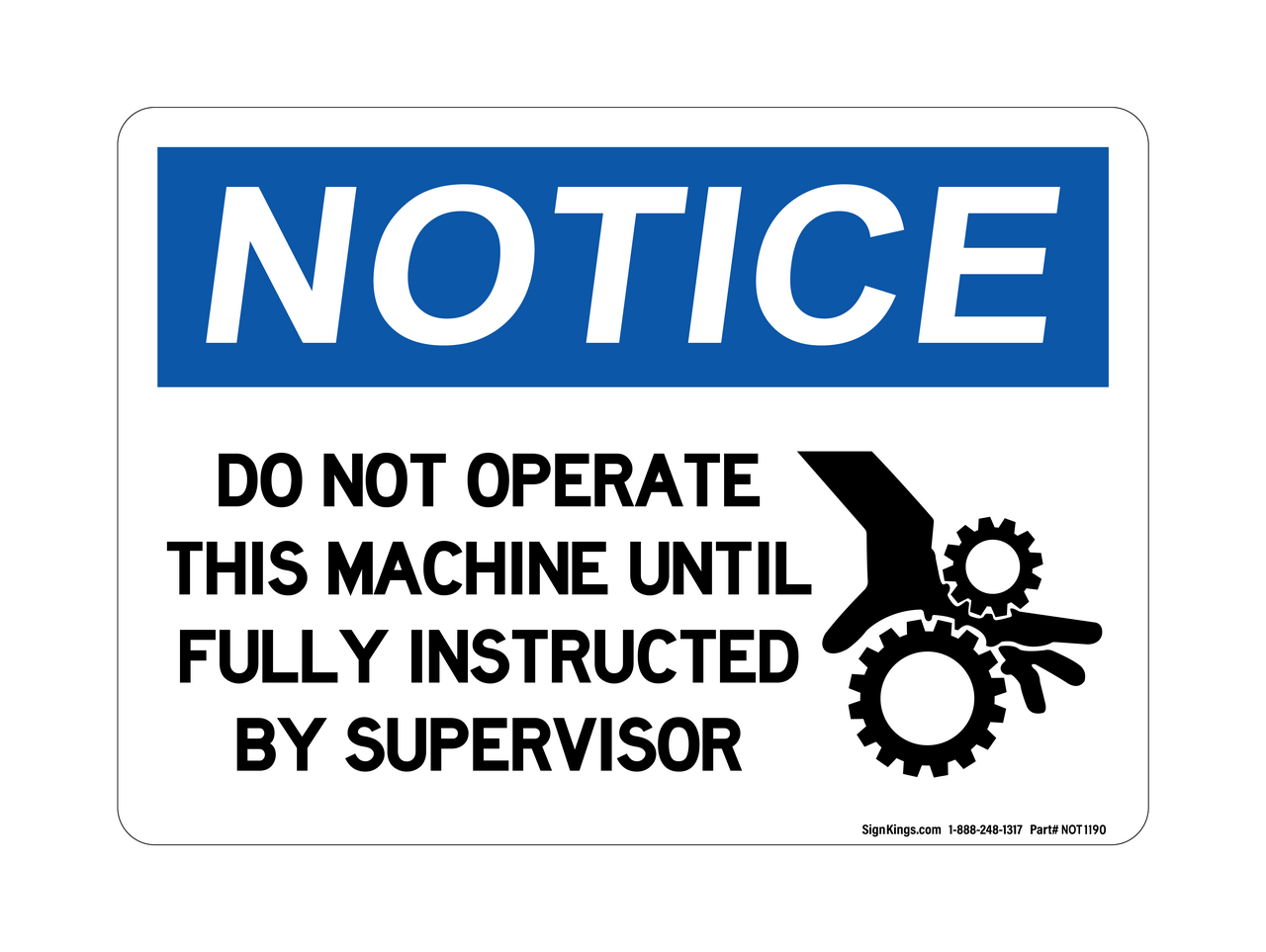 "Do Not Operate This Machine Until Fully Instructed by a Supervisor (With Hand In Gears Symbol)" Notice Sign (Part#: NOT1190)