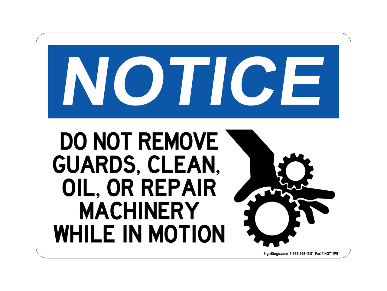 "Do Not Remove Guards, Clean, Oil, Repair Machinery While In Motion (With Hand In Gears Symbol)" Notice Sign (Part#: NOT1195