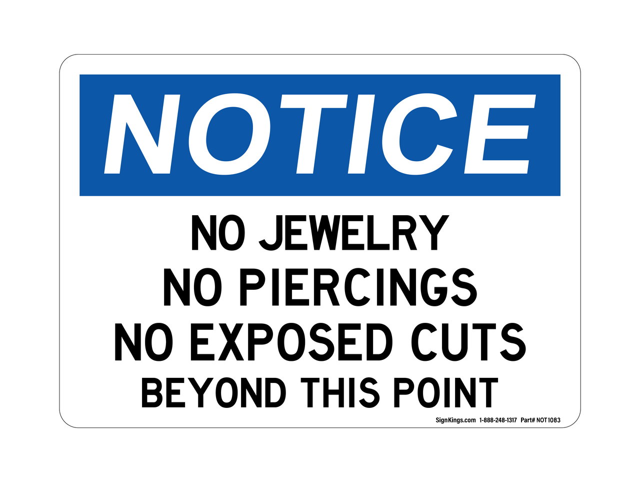 Notice Signs: No Jewelry, No Piercings, No Exposed Cuts Beyond This Point