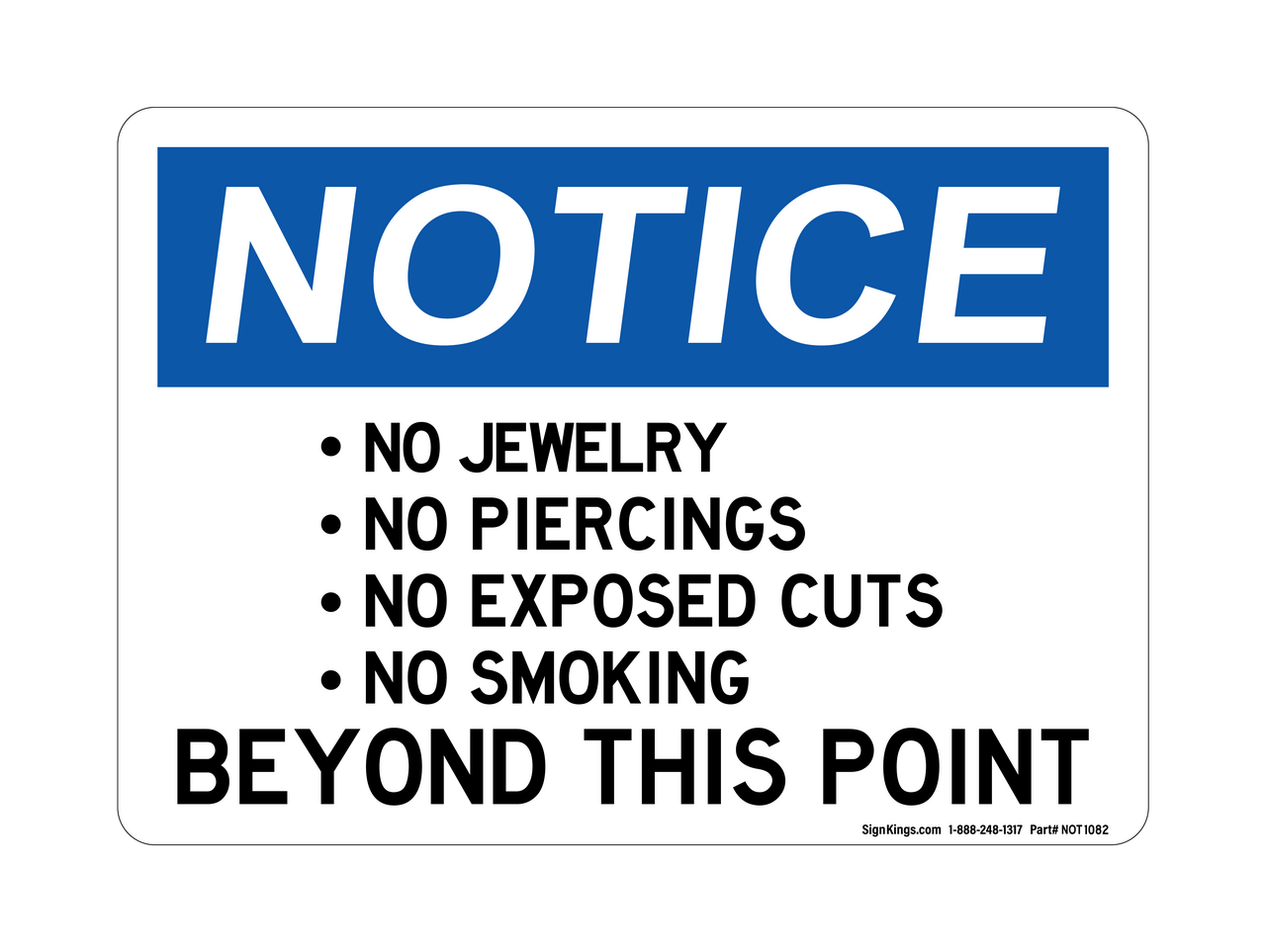 Notice Signs: No Jewelry, No Piercings, No Exposed Cuts, No Smoking
