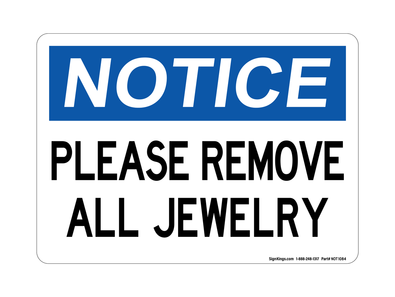 Keep your property, guests and staff safe with our highly visible “Please Remove All Jewelry” sign. Place these signs where there is risk of injury or damage from unauthorized handling of an object or area.